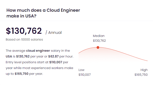 “The average cloud engineer salary in the USA is $130,762 per year or $62.87 per hour. Entry level positions start at $110,007 per year while most experienced workers make up to $165,750 per year.” ~ Talent.com article